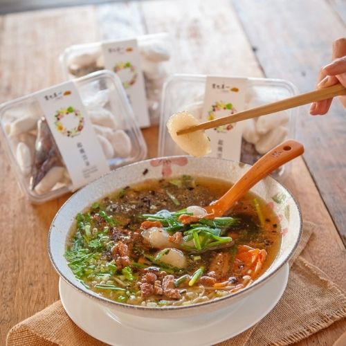 因早年薑麻園村並不富裕,總是衣食短缺,甚至過以農作物換取物資的方式生活,而涂家長輩為了讓孩子健康成長,在那個不容易吃到肉的年代,以樹薯粉製成似雲朵的麵疙瘩,搭配簡單自耕的菜湯養足一家,而後將【起飛雲朵】流傳到現在即將三代,口味依舊始終如一。